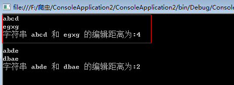 23 Console.WriteLine("字符串 {0} 和 {1} 的编辑距离为:{2}\n", str1, str2, LD());