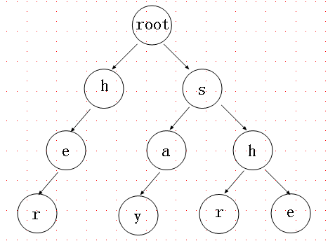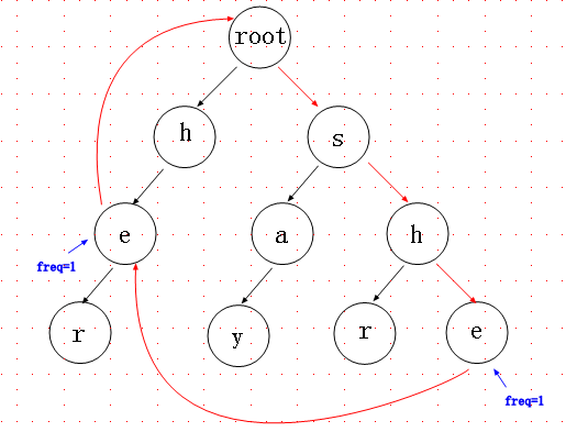 针对图中红线的”h,e“这两个节点,我们想起了什么呢?对”her“中的”e“来说,e到root距离的n个字符恰好与”she“中的e向上的n