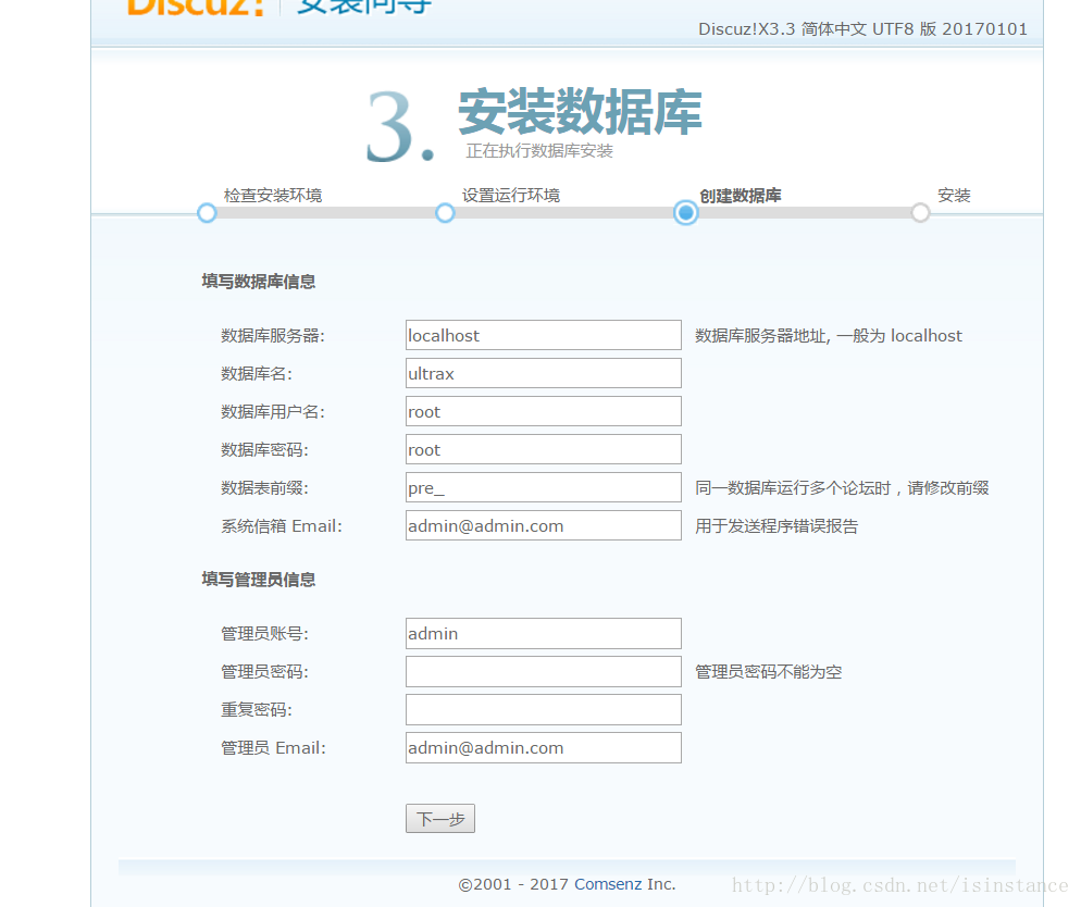 然后把自己数据库用户名和密码填进去,再设一个自己的管理员密码就ok了