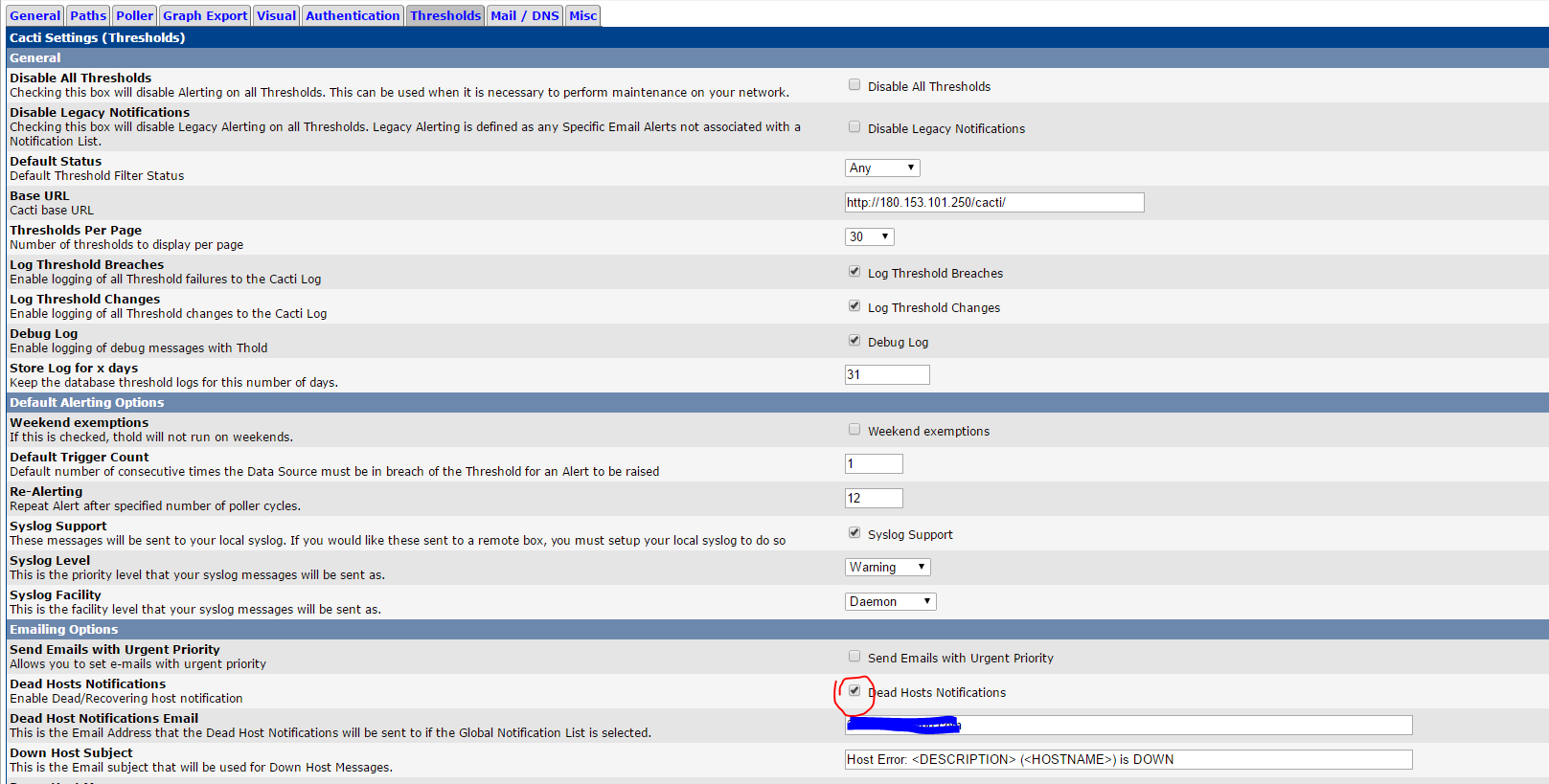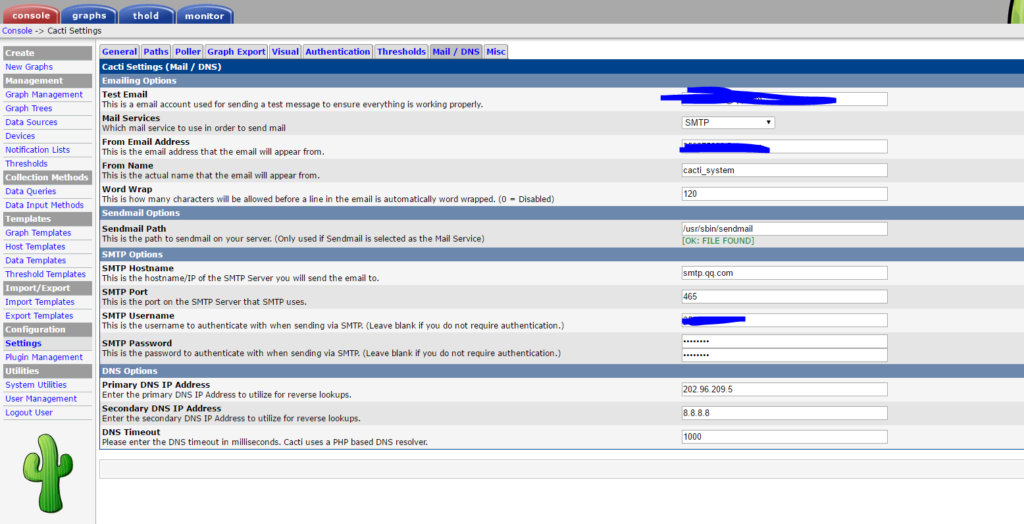 3:配置cacti邮件告警,并配置主机宕机状态告警:(不配置邮件应该也可以,只是可以更直观的发现触发邮件告警的时候,同时触发了微信告警)
