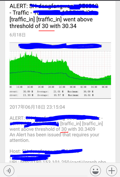 把这个模板应用到某个主机端口上,如果流畅超过30M,则触发告警,告警如下: