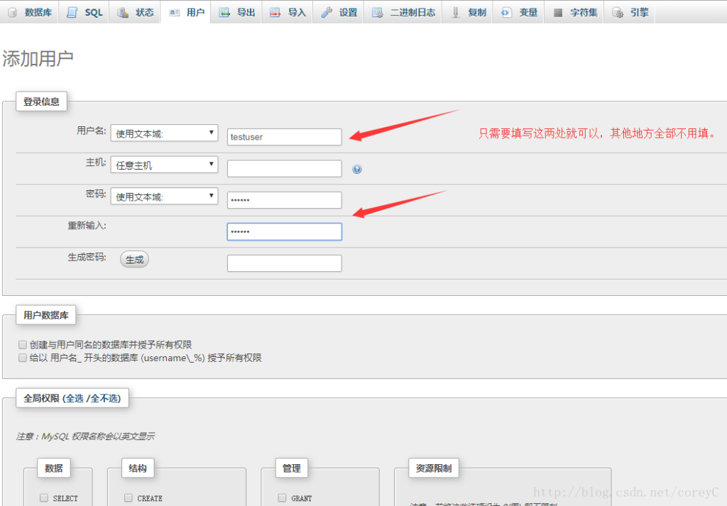 利用phpmyadmin设置mysql的权限方法 2025年1月27日2018年3月27日 作者 @hostease第一步:登陆root用户。第二步:新建一个数据表,并且选好排序规则,此处我使用testtable。第三步:我们新建一个用户输入相关的账户名以及密码就可以。第四步:我们对刚才添加的用户 testuser 编辑权限:进入页面之后,我们只需选择按数据库制定权限。全局权限不用勾选。点击之后会出现一个权限页面,全选执行即可。此时我们登陆的testuser后看见的就只有testtable库,以及此表的相关操作权限。相关