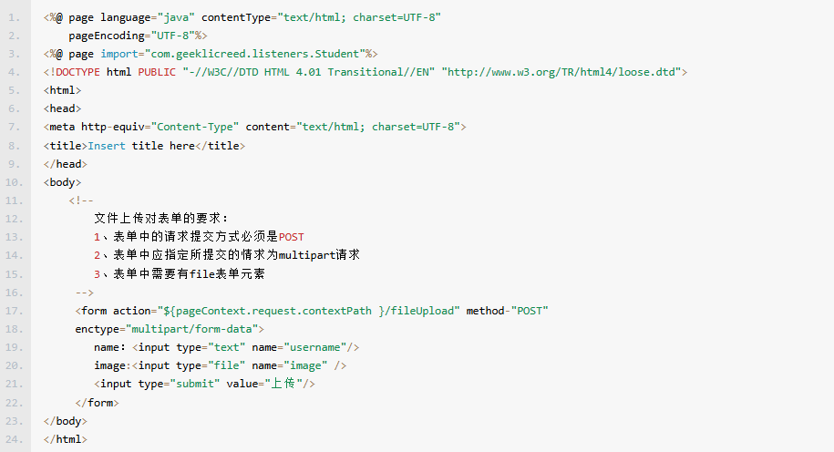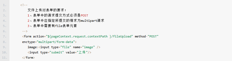 – 文件上传要求客户端表单提交特殊的请求–multipart请求,即包含多部分数据的请求。所以文件上传表单对于表单数据的编码类型要求,必须为multipart/form-data。即要为<form>标签指定enctype属性值为“multipart/form-data”。(enctype,即encodingtype,编码类型。)