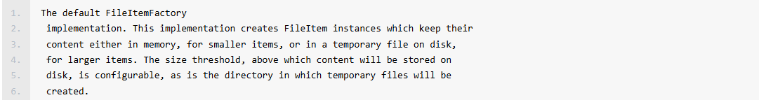– org.apache.commons.fileupload.disk.DiskFileItemFactory类:默认的FileItemFactory实现类。这个实现创建FileItem实例(文件条目)。如果是小条目,会将其存入内存中,如果是大条目,会将其存入硬盘中的临时文件。大小条目数据的临界值,是可配置的。
