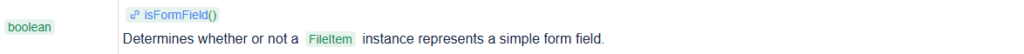 This class represents a file or form item that was received within a multipart/form-data POST request.– isFormField方法:判断FileItem实例是否为一个普通form项: