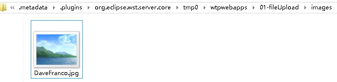 – 启动web应用,访问index.jsp,添加图片后,点击“上传”,可以发现控制台打印结果,在工作空间web项目的指定目录可以看到图片已经上传:(在Eclipse中,默认会把Web项目放到Eclipse的工作空间下的.metadata\.plugins\org.eclipse.wst.server.core\tmp0(或者是tmp1)\wtpwebapps\下)