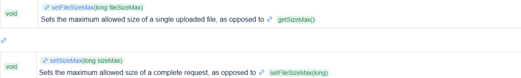 – setFileSizeMax(long fileSizeMax)方法设置单个上传文件允许上传的最大边界值。